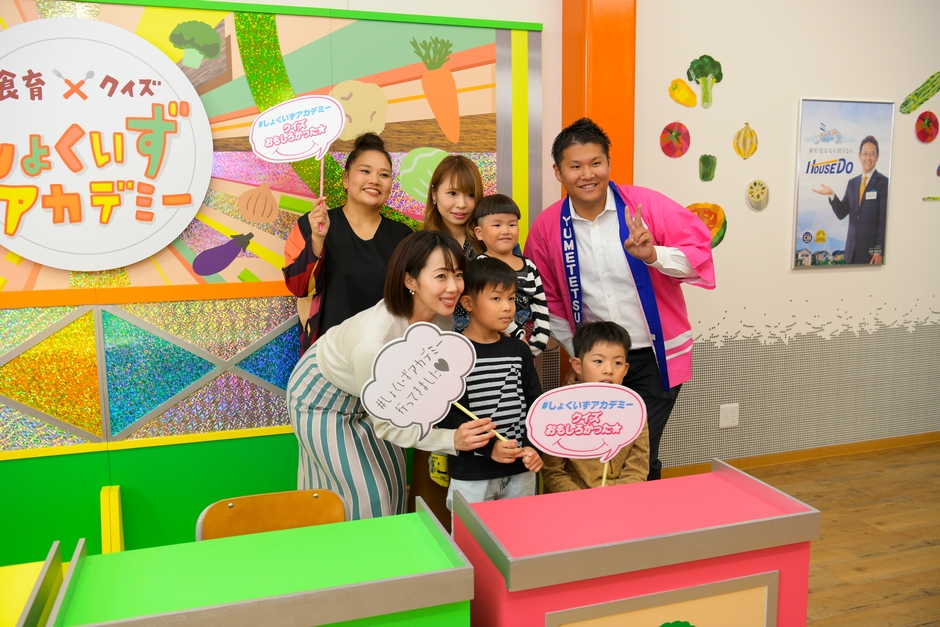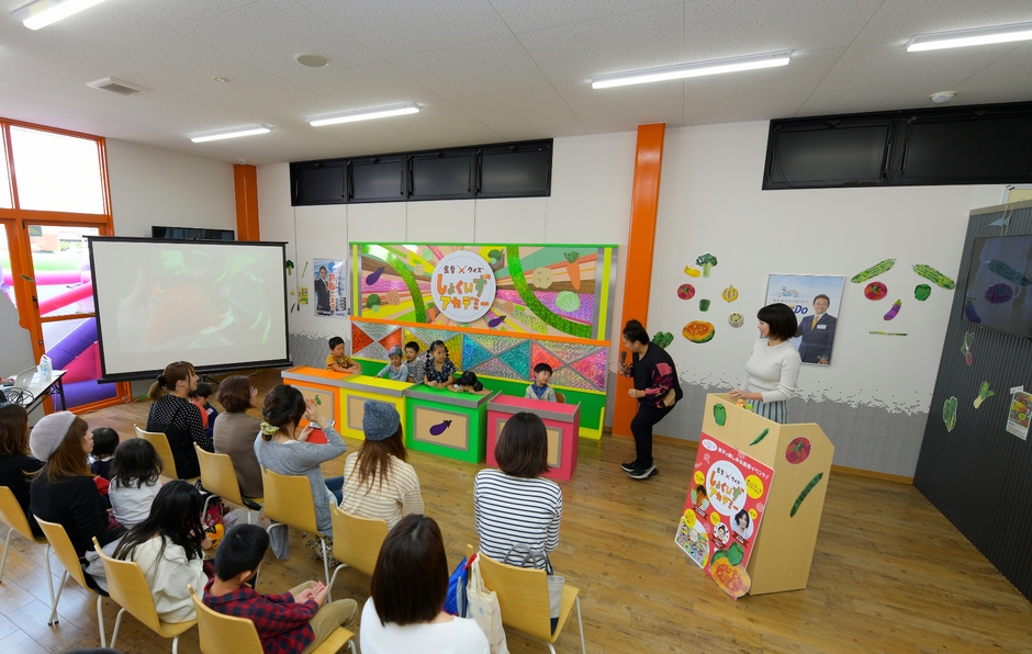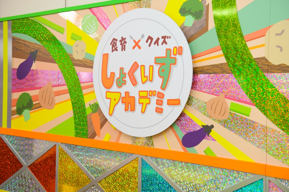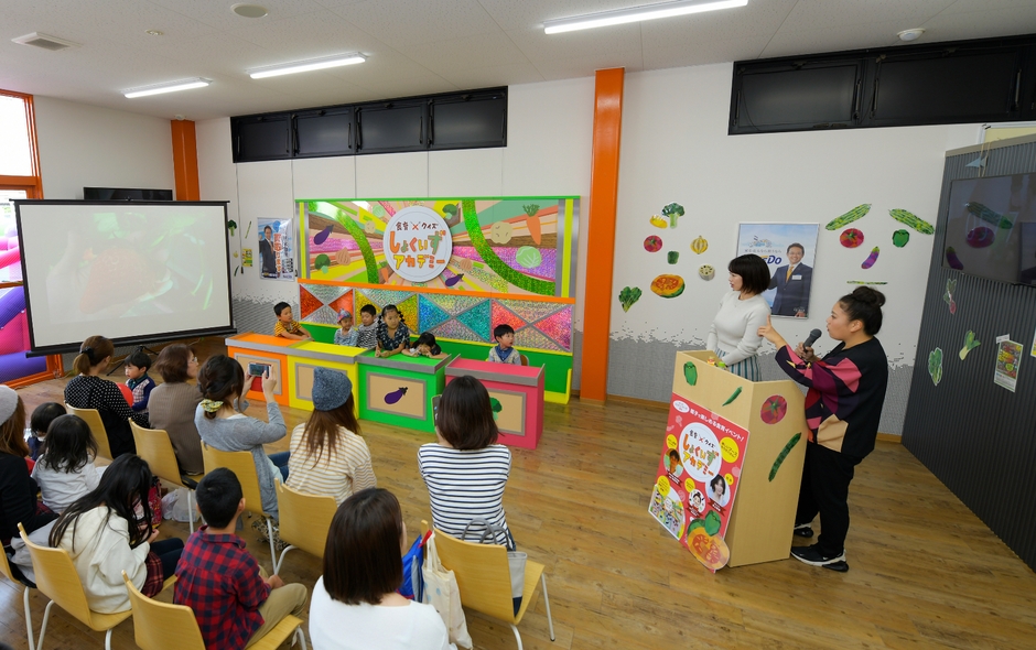 メインコンテンツはテレビの美術スタッフが手がけたクイズ風番組セットで、子供達が食育クイズに答える【しょくいずアカデミー】です。