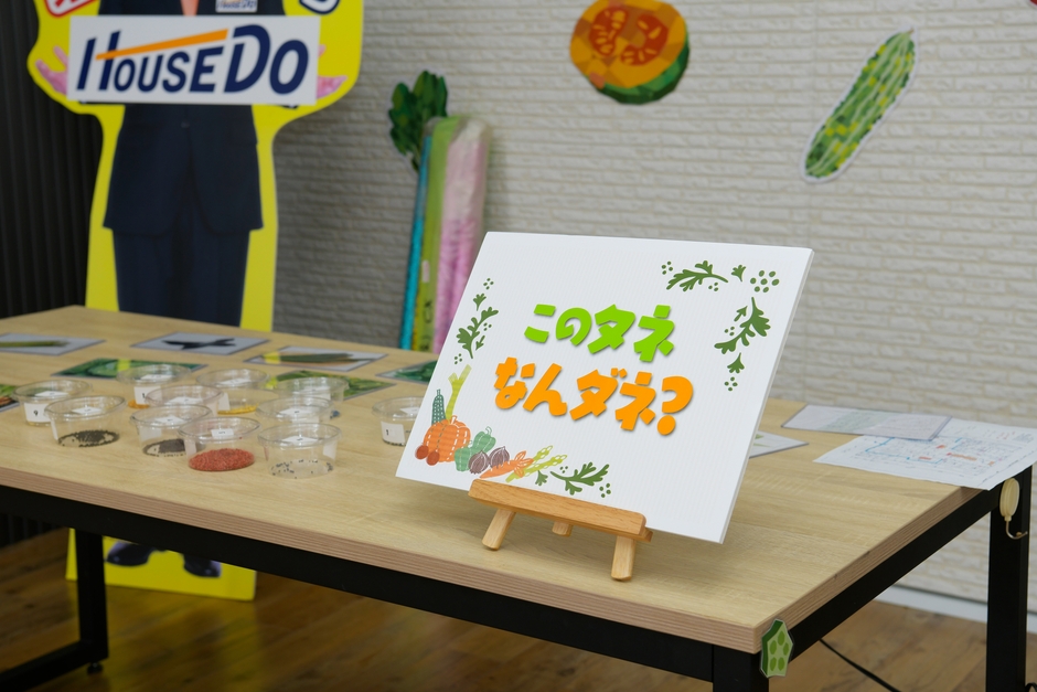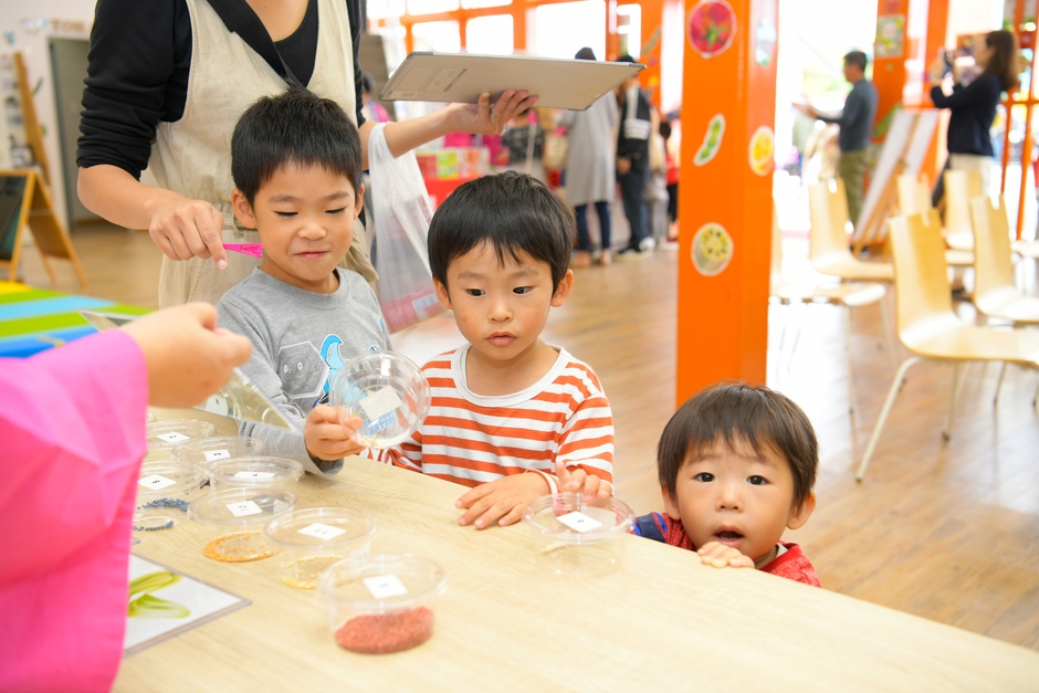 野菜の種を展示し、種の色や形でなんの種かを当てて色々な種を学んでいました。