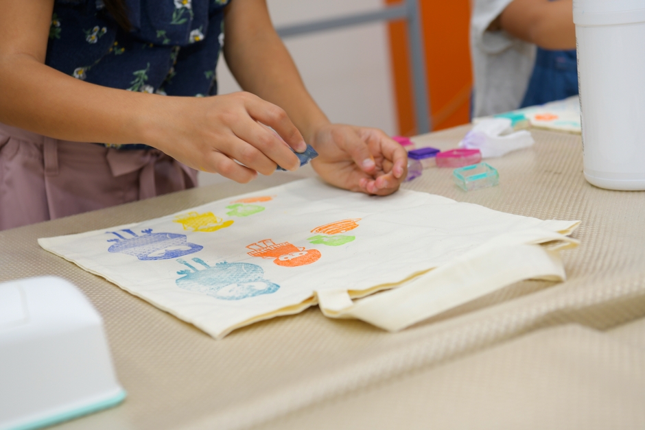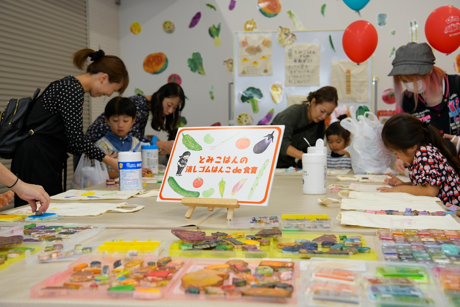 消しゴム版画イラストレーター ・とみこはんの食べ物をモチーフにしたはんこなど100個の中から、お好みのはんこをエコバッグに押すワークショップです。