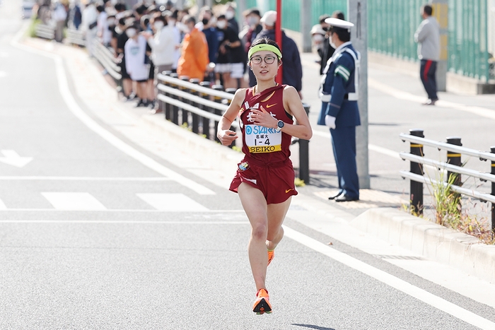 6.6kmの1区は1年生の米澤奈々香選手が任された。今シーズン前半は膝のケガで走れず苦しんだ時期もあったが、10月1日の「Athletics Challenge Cup 2022」(新潟市)の5000mで15分31秒63と自己記録(15分31秒33)に迫るタイムをマークして復調をアピール。準備万端でこの日を迎えていた。スタートの競技場内で早くも先頭に立つと、最初の1kmは3分07秒で通過。先頭争いは序盤から立命館大学の村松結選手(1年)との2人に絞られたが、米澤選手が4km付近でスピードを切り替えて村松選手を突き放した。
