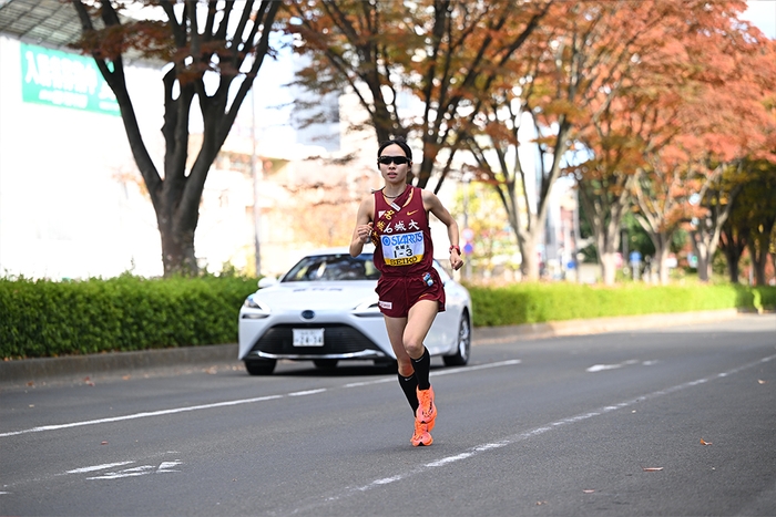 5000mで毎年自己記録を更新し、最終学年では大記録を樹立。米田監督も「理想的なタイムの伸び方」と讃えている。この駅伝でも独走状態のなかで快走し、小林成美選手(4年)が2020年に打ち立てた区間記録に並ぶ21分37秒の区間タイ記録で区間賞を獲得。「狙っていた区間新記録は出せなかったのですが、成美と同じタイムということで、お揃いになってうれしいです」と喜んだ。この区間で後続チームの順位は変動。立命館大学が4位から2位に浮上、日本体育大学が3位、大東文化大学が4位と、往年のライバル校たちがこの区間で順位を上げていたが、名城大学は2位に1分32秒差と大きくリードして次の区間へタスキをつないだ。
