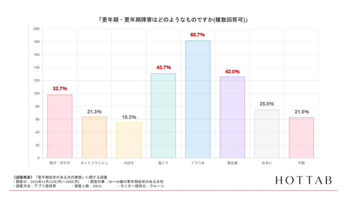 『イラつき(60.7%)』『肩こり(43.7%)』『倦怠感(42.0%)』『発汗・冷や汗(32.7%)』『めまい(25.0%)』と様々な症状に悩まされている様子から、