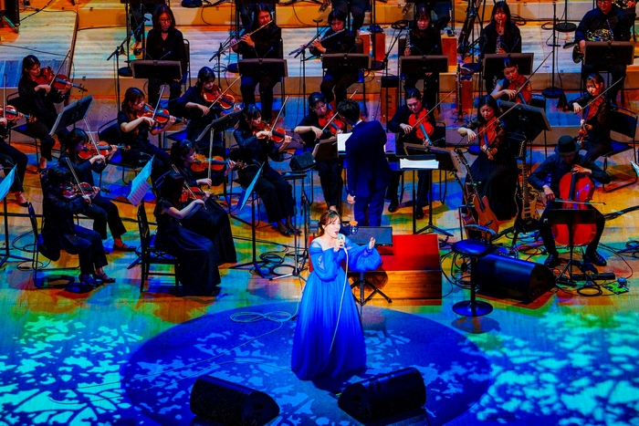 コンサートは静かなピアノ演奏の中、柔らかなブルーの衣裳で登場した平原の『明⽇』の歌唱から始まった。大きな拍手の中、やさしい歌声とハープの音色で始まり、オーケストラの演奏が加わると、温かで重厚感のある空気が客席を包み込む。そのままアイルランド民謡のカバー『Danny Boy』、『ありがとう』、『Don’t Cry』と続き、耳と心に音楽が満ちていくような時間に浸る。歌い終えた平原が客席に「こんばんは!」と声をかけると、観客も「こんばんは!」と返すとうれしそうな笑顔を見せ、「平原綾⾹Jupiter基⾦ の活動に賛同し、来てくださってありがとうございます。今日はみなさんに感謝の気持ち、そして能登半島地震で被災された方々に届けたいと思います。最後まで楽しんでください」と挨拶。ピアノ伴奏で『からっぽのハート』を歌いあげた。