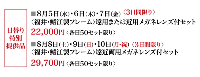 福井・鯖江製フレーム+レンズセットを各日限定50セット限りにてご用意いたします。メイド・イン・ジャパンならではの、日本人の顔立ちに合わせて設計された掛け心地の良さはもちろん、カラーやデザインにこだわってつくられています。