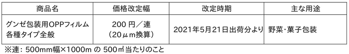 つきましては、お客様への安定供給の責任を果たすため、OPPフィルム製品の価格改定を行うことといたしました。