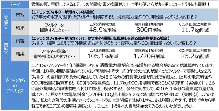 ダイキン工業株式会社は、このたび、エアコンのフィルター掃除や室外機周辺の片付けによる具体的な節電効果を探るため、実際の住宅に設置されているエアコンを使った実験を通じて調査し、結果をまとめました。