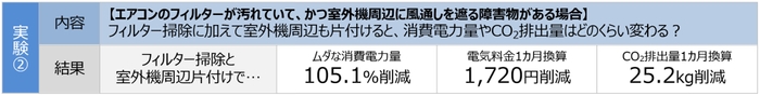 約3年分のホコリが溜まったフィルターの場合、ホコリを取り除いてキレイな状態にすることで、フィルターの目詰まりで余分に発生していた48.9%分の消費電力量を削減できました。1ヵ月の電気料金やCO2排出量に換算すると、800円の電気料金、11.7kgのCO2を削減できたことになります(実験①)。フィルター掃除に加えて、さらに室外機周辺の障害物を片付けて風通しも良くすると、余分に発生していた105.1%分の消費電力量が削減でき、1ヵ月あたりの電気料金1,720円、CO2排出量25.2kgの削減につながりました(実験②)。