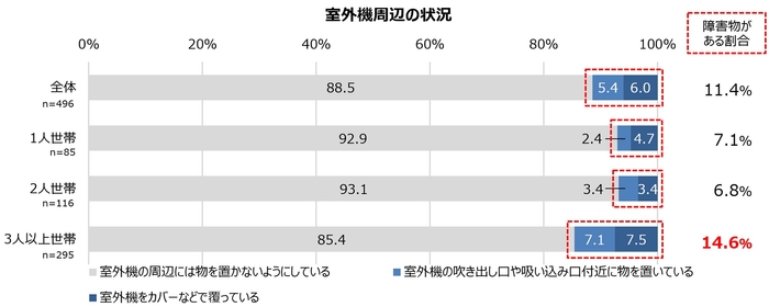 3人以上世帯の14.6%で室外機周辺に障害物がある