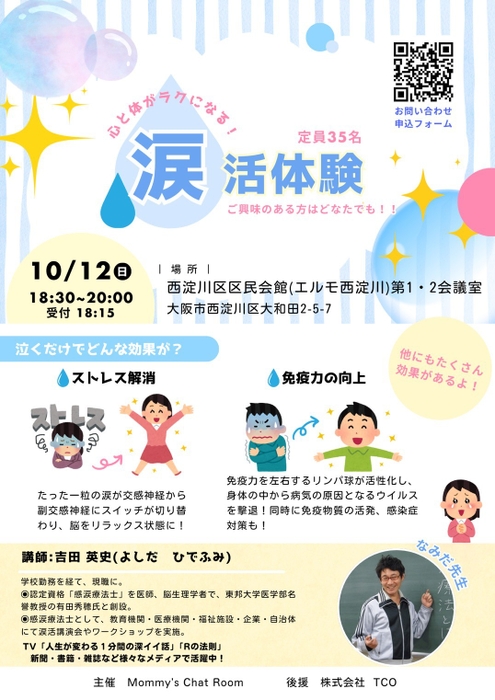 通称「なみだ先生」として、企業・自治体・教育機関・医療機関・福祉施設向けの「涙活」講演などを手がけている、感涙療法士の吉田英史は、2025年10月12日(日)に大阪市の西淀川区民会館で「涙活(るいかつ)」ワークショップを実施します。涙の効能やストレス解消法の講義、泣ける映像の視聴を通じて、参加者に涙活を体験してもらい、泣きやすい体質づくりを目指します。