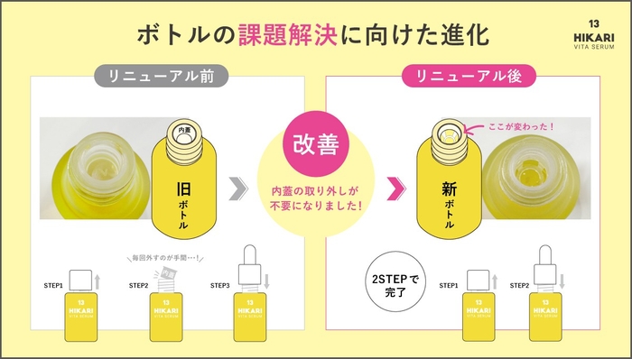 高濃度ビタミンC配合の美容液は、その効果の高さから近年の美容市場で人気を集めていますが、ビタミンCの特性上、酸素や光に触れると効果が低下するという課題があります。これまでの「ヒカリビタセラム」では、製品の酸化を防ぐため内蓋を使用していましたが、使用時には毎回この内蓋を取り外す必要があり、ユーザーの利便性に課題がありました。