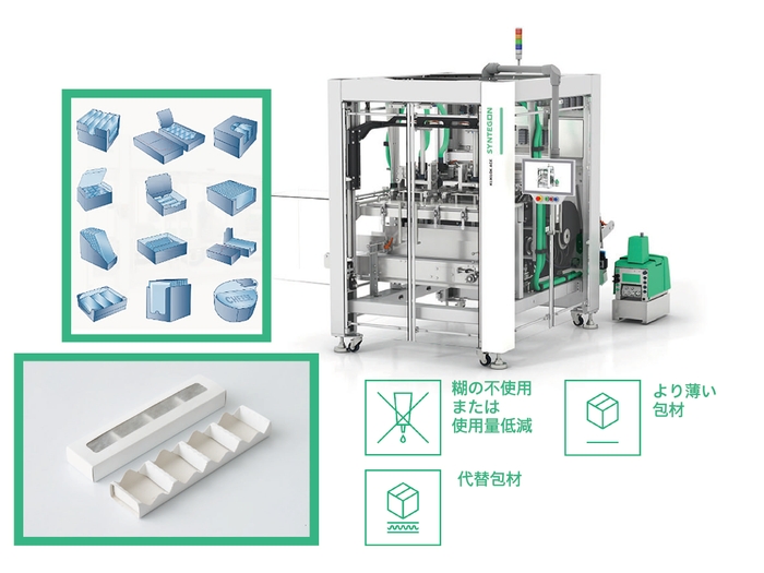 超音波シール式により、糊を使わず紙トレー、カートンの成形・封函を行うサステナブルに対応した成形機。製品サイズに合った紙トレー、カートン成形ができる。