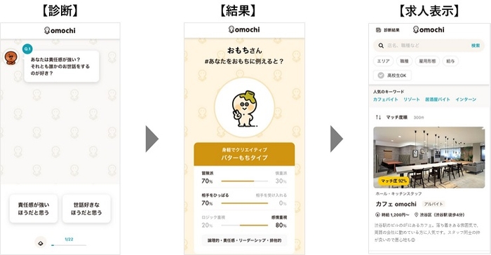 「omochi」は、21項目の質問から分かる「おもちキャラ診断」の結果を元に、全国60万件以上の求人情報から「自分にマッチする求人を探せる」バイト・インターン求人検索エンジンです。バイト・インターンを探す求職者は、自分の「行動特性」に関する21の質問に回答(2択式)することで、「しょうゆもち」「あんこもち」など8種類のおもちに分類され、自分のキャラ<「性格特徴」「合っている職場のタイプ」など>を知ることができます。「omochi」は、キャラ診断の結果と希望勤務地に基づき、マッチ度が高い順に求人情報を表示しますので、求職者は勤務地や業種、仕事内容だけでなく、自分とのマッチ度も考慮してバイト・インターンを探すことができます。