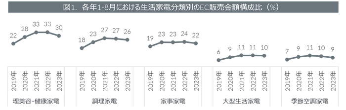 ・2023年18月におけるEC販売金額構成比は、5つの生活家電分類*2で前年同期から13%ポイント縮小