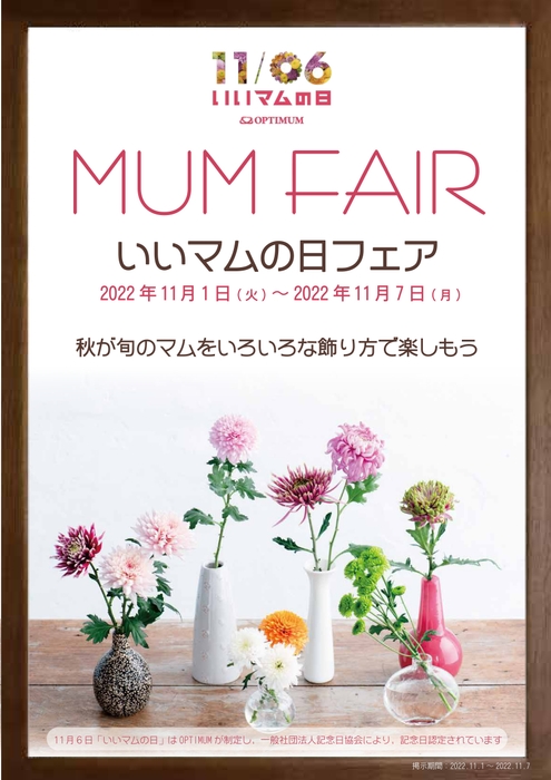 国内のマム生産者により組織され、マムの花の普及とPRをする団体OPTIMUM(オプティマム)https://mum-optimum.jimdofree.com が、菊の節句(重陽の節句)である2021年9月9日に、11月6日の「いいマムの日」を一般社団法人日本記念日協会に記念日登録を行いました。