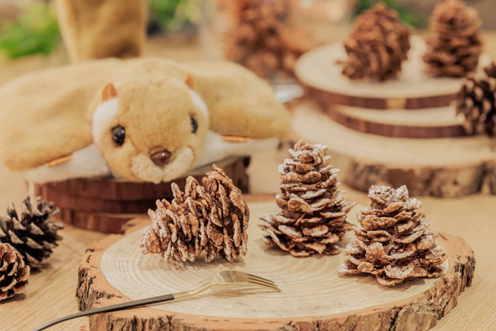 ムササビの好物は松ぼっくり!森に生息するムササビは、松ぼっくりの隙間にある種子を好んで食べます。チョコレートでアレンジしたまるで本物のような松ぼっくりスイーツを、ムササビ気分になって楽しむことができます。