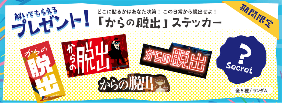 7月7日(金)〜8月31日(木)までにリアル脱出ゲームを遊んでいただいた方に、SCRAPから感謝謎をプレゼント! さらに、謎を解いた後もう一度リアル脱出ゲーム常設店舗にご来場いただいた方限定で、「からの脱出」ステッカーもプレゼントしちゃいます。