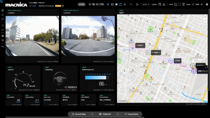 ※5:車両に取り付けられたセンサー(GPS、カメラ等)と車両のCAN情報(車速、回転数、ステアリング舵角等)を収集し、高品質な伝送方式を用いてクラウドへデータを保存することで、1人で複数台の車両を遠隔から監視者がクラウドにアクセスし、リアルタイムでモビリティの状況確認ができます。その他、蓄積されたデータから過去の状況確認、データ分析、AI活用にも応用活用できます。