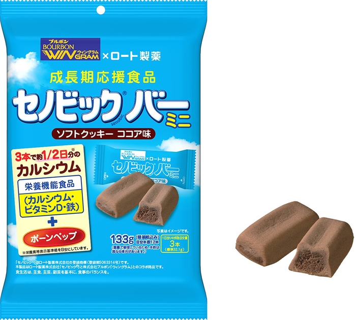 「セノビックバーミニソフトクッキーココア味」は、ロート製薬株式会社「セノビック(R)」と株式会社ブルボン「ウィングラム」とのコラボレーション商品です。