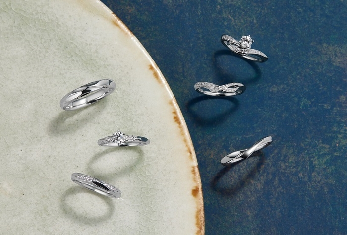 優美な水面の波模様を表す季語をモチーフに、ほっそりとしたアームに有機的なテクスチャーをデザイン。サイドビューを彩る菱形の空間からも光が注がれ、ダイヤモンドが繊細な輝きを放ちます。陽光にきらめく川の情景のように、穏やかな日々の幸せを大切にしたいおふたりに。