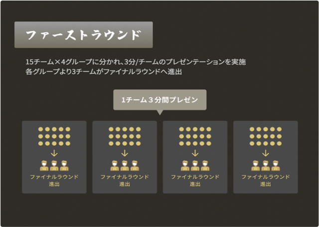 決勝大会では、まずファーストラウンドを実施。15チーム×4グループに分かれてチームごとに3分のプレゼンテーションを行い、各グループより3チーム(計12チーム)がファイナルラウンドへと進出できます。ファイナルラウンドに進んだ12チームは最終プレゼンテーションを行い、その内容を元に優勝、準優勝が決定されます。