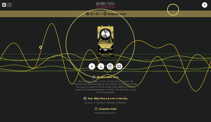 ソフトウエアを起動すると、各エフェクターのサウンドをイメージさせる「オノマトペ」が文字で表示され、その「オノマトペ」を表す楽曲が流れます。操作も簡単でモバイル端末の画面に表示されるボタンやパソコンのキーを押すだけで、サンプル音源とアニメーションが同時に再生し、まるでセッションしているような体験ができます。