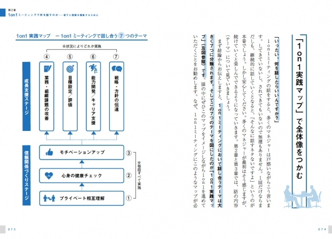 本書では、1on1の意義や全体像がひと目でわかるよう「話し合う7つのテーマ」のマップを用意。「信頼関係づくりステージ」と「成長支援ステージ」の大きく2つに分けて解説していきます。