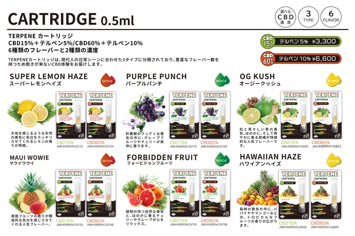 昨今、CBDの人気は凄まじく多くの方に使用していただけるようになりました。そこで、お客様に新たな価値を感じてもらいたいという一心で、CBDマーケットにおける次のトレンドといわれる「テルペン」にクローズアップした製品を開発いたしました。テルペンの香りの効果により、現行のCBDユーザーのニーズを更に深堀りし、より高い満足度をご提供します。