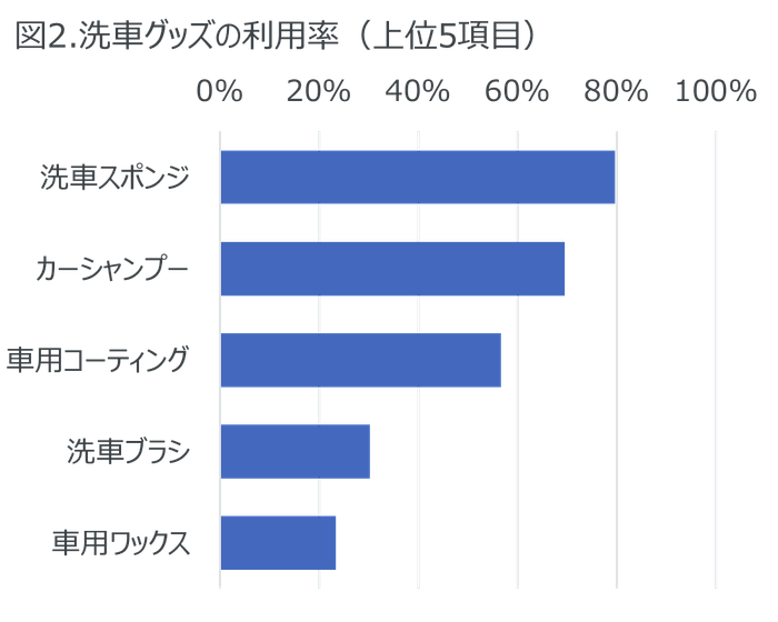 自分で手洗い洗車をする人の多くは自宅の駐車場や庭(86%)で行っており、洗車場を利用する人は9%であった。洗車時に使用する用品では洗車スポンジが80%、カーシャンプーが70%、車用コーティングが57%であった(図2)。カーシャンプーなどの用品を購入する際に参考にしている情報源は「インターネット上のレビューなど」が12%、「商品パッケージ」や「店頭の販促物」が10%、「YouTube動画」が8%であった。洗車頻度が多い人ほどインターネットのレビュー、YouTube動画を見る割合が高い傾向が見られ、よく使うアイテムだからこそ使用感を確認したいものと思われる。
