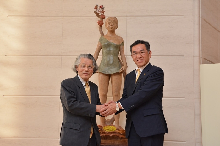 これは、松岡様より、福山市で初開催となる「ばらのまち福山国際音楽祭」を記念し、彫刻作品「バラの心」の寄附の申し出がなされたことにより行われたものです。寄附していただいた彫刻作品は、「ばらのまち福山国際音楽祭」が開催される、ふくやま芸術文化ホール(リーデンローズ)ホール内に展示し、来館者の方々にご鑑賞いただけます。