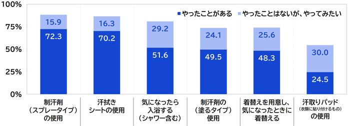 自分のワキ汗や汗のにおいが気になる人に、ワキ汗や汗のにおいが気になったときにどのような対策をしているか聞いたところ、実施経験率(「やったことがある」)の1位は「制汗剤(スプレータイプ)の使用」で72.3%、2位は「汗拭きシートの使用」で70.2%、3位は「気になったら入浴(シャワー含む)する」で51.6%、4位は「制汗剤(塗るタイプ)の使用」で49.5%、5位は「着替えを用意し、気になったときに着替える」で48.3%となり、“制汗剤”や“汗ふきシート”による対策を行っている人が多いことがわかりました。また、“入浴”や“着替え”といった対策をしたことがある人も少なくないようです。