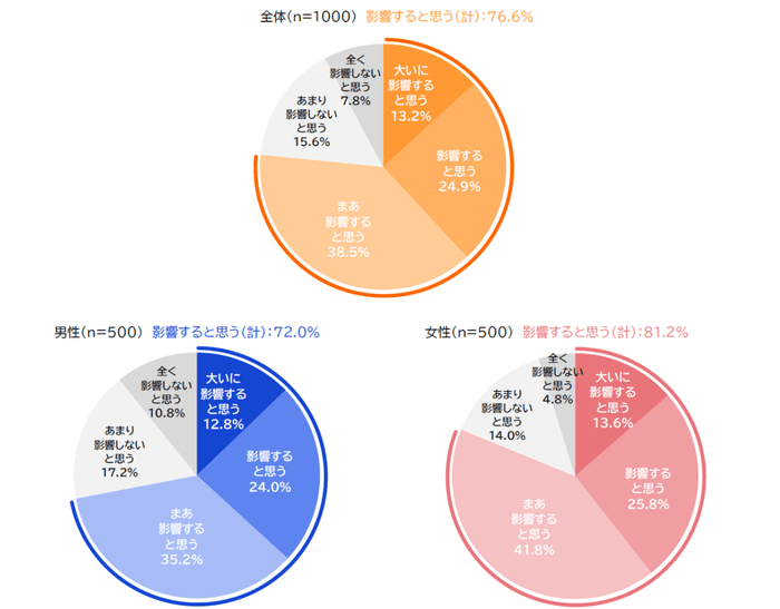 ・「ワキ汗や汗のにおいが、人間関係に影響すると思う」全体76.6%、女性81.2%