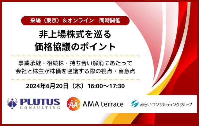 みらいコンサルティンググループ(本社:東京都中央区、代表:久保 光雄 岡⽥ 烈司)は、セミナー「非上場株式を巡る価格協議のポイント 事業承継・相続株・持ち合い解消にあたって会社と株主が株価を協議する際の視点・留意点」を2024年6月20日に東京会場とオンラインで同時開催いたします。