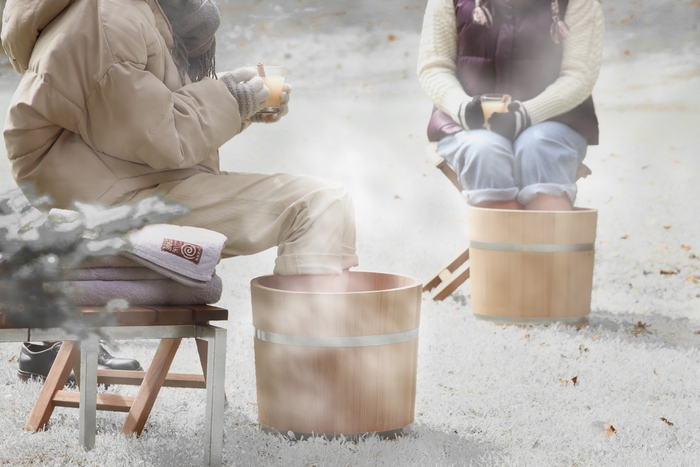 冬の昼下がりの森の広場で、美肌の湯として知られるトンボの湯の温泉を自分専用の湯桶に満たし、自然を眺めながらゆっくりと足湯を楽しむことができます。おひとり様はもちろん、カップルや友人グループなど最大3名様まで利用することが可能です。足湯に浸かることにより、からだの内側からすっきりし、心身ともにリフレッシュすることができます。