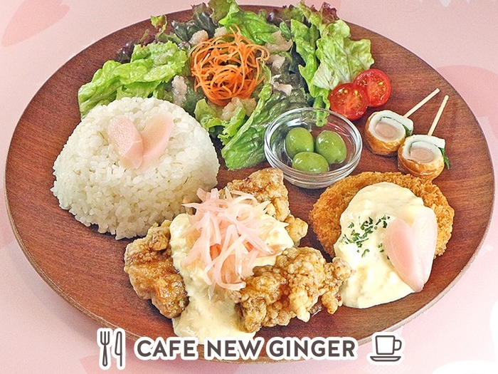カフェニュージンジャーでは、「岩下の新生姜タルタルソース」がポイントのプレートとバーガー、岩下の新生姜のスライス2枚でうさぎの耳を表現した“うさみみ”仕立てのメニューを期間限定で提供します。