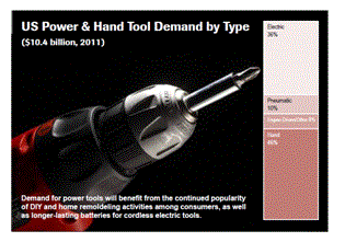 ザ・フリードニア・グループ社によると、米国のパワーツール・ハンドツールへの需要は年率4.8%にて成長の見込みで2016年には131億ドルに達し、2006年から2011年の低迷から回復すると予測しております。住宅投資の回復など、主に建設部門における需要が市場成長の要因となると考えられ、DYIや住宅の改築などへの人気がパワーツールへの新たな販売機会を生むと期待されております。しかしながら、価格競争の激化が市場成長の阻害要因となる可能性もあります。流通チャネルにおいては、パワーツール・ハンドツールのインターネットによる通信販売が発展し、今後、重要なチャネルとなるとなる見込みです。