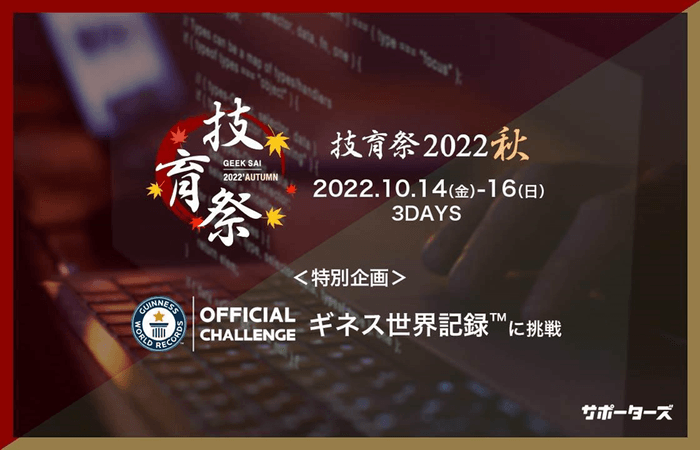株式会社CARTA HOLDINGSのグループ会社で、キャリア支援事業を展開する株式会社サポーターズ(東京都渋谷区、代表取締役:楓 博光)は、エンジニア学生向けテックカンファレンス「技育祭2022【秋】」を、10月14日から3日間にわたって、オンラインにて開催いたします。今回が5回目の開催となり、エンジニア学生約3,000名が参加する見込みの国内最大級(サポーターズ調べ、2022年8月時点)のテックカンファレンスとなります。