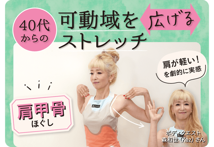 普段、デスクワークなどで猫背の姿勢が多くなりがちなミドル世代。肩こりや四十肩などに悩まされていませんか? 日々忙しくて運動する時間が取れない人でも、簡単に続けられる「肩甲骨ほぐし」ストレッチをヨガ&エクササイズトレーナーでもある森和世(Kaz)さんに教えていただきました。