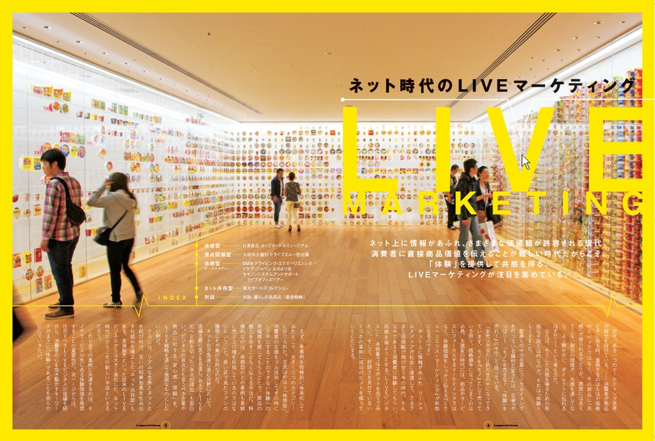 特集は「ネット時代のLIVEマーケティング」。ネット上に情報が溢れ、さまざまな価値観が許容される現代。消費者に直接商品価値を伝えることが難しい今だからこそ注目を集めている、「体験」を通して共感を得る「LIVEマーケティング」を紹介します。
