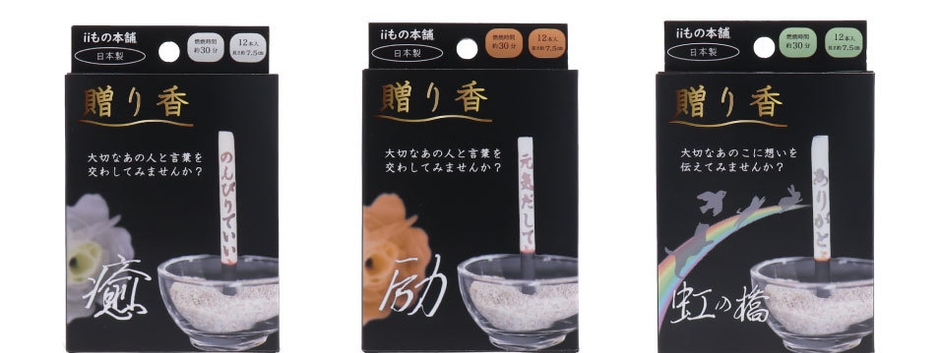 株式会社iiもの本舗(本社:群馬県佐波郡、代表取締役:市石 一仁)は、大切な人や大切なペットと「言葉を交わしたい」「想いを伝えたい」そんな方に向けてそっとプレゼントしたくなる、文字の浮き出るお線香『贈り香』(癒・励・虹の橋 3シリーズ/各12本入り)を2022年9月1日に新発売しました。