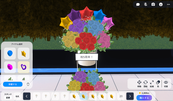 本機能は台座・装飾パーツ・メッセージを自由に組み合わせ、自分だけのフラワースタンドをデザインできるバーチャル空間ならではの推し活体験ができる機能です。作成は無料で、「外観エリア」内に設置されたバーチャルフラワースタンド作成エリアにて、どなたでもご利用いただけます。ファンの皆さまからのお祝いや応援の気持ちを込めた、オリジナルのフラワースタンドをぜひご制作ください。