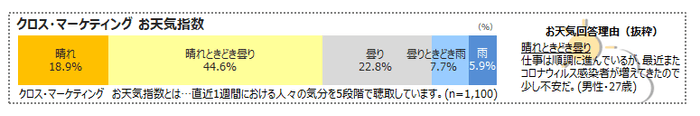 クロス・マーケティングお天気指数とは、直近1週間における人々の気分をお天気で表したものです。お天気の理由も一部抜粋してお知らせします。