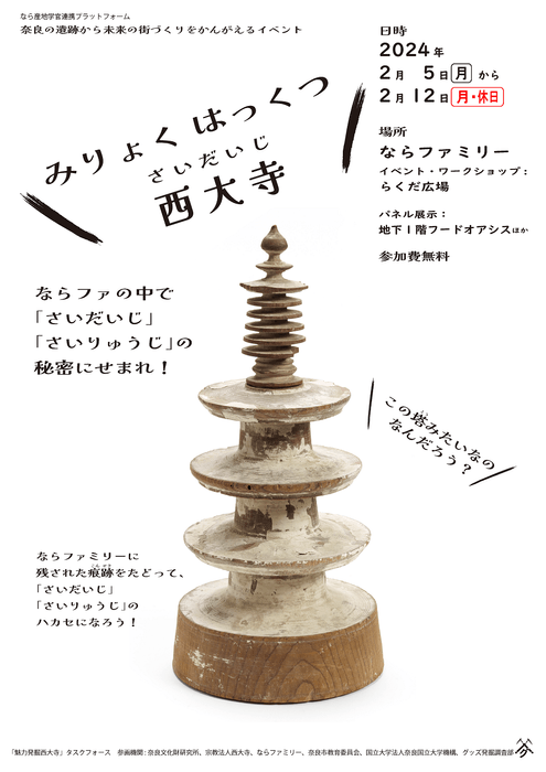 奈良市西大寺にある商業施設「ならファミリー」で、遺跡から西大寺の街づくりを考えるイベント「魅力発掘西大寺」を開催します。