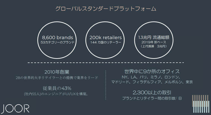 「JOOR(ジョア)」はファッションの世界で業界標準の卸売プラットフォームとして、月次で$1.5B(約1600億円)のGMV(卸売金額)を扱っています。8,600を超えるブランドと144カ国を超える200,000以上の洗練された小売店を結び付けています。