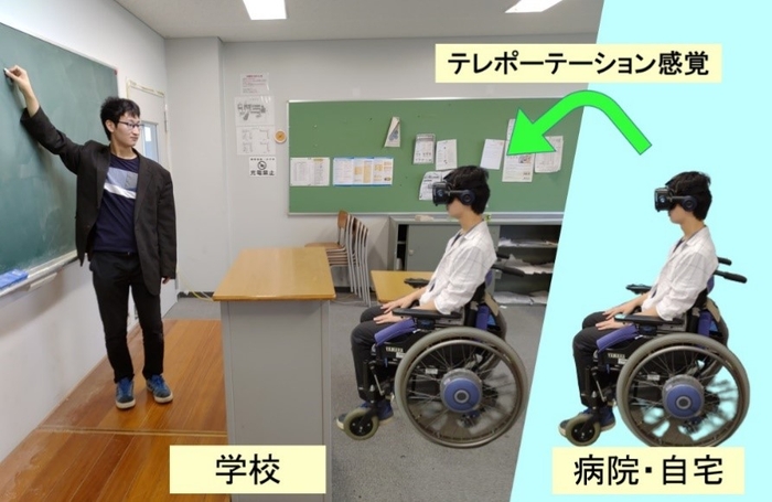 テレポーテーション感覚体験とは、教室においた全方位カメラとVRの技術を使った遠隔臨場感システムです。HMD(ヘッドマウントディスプレイ)を装着すると、自宅や病院にいながらまるで教室に瞬間移動したかのように、右を向けば右の映像を、左を向けば左の映像を見ることができます。音声で対話もでき、効果的に遠隔授業を受けることができる遠隔臨場感システムを体験できます。