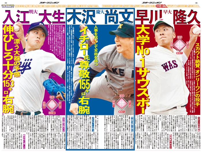 10月26日に東京都内で開催されるプロ野球のドラフト会議(新人選手選択会議)。今年は早大の155キロ左腕・早川隆久投手、アマ球界№1スラッガーの近大・佐藤輝明内野手、大学進学から一転、プロ志望を表明した中京大中京の154キロ右腕・高橋宏斗投手に人気が集まりそうです。「’20年ドラフト特集号」では先に挙げた3選手を詳報するほか、福岡大大濠・山下舜平大投手の独占インタビュー、明石商・中森俊介投手、来田涼斗外野手ツイントークなど1位候補から隠れた逸材まで、全国の取材網を駆使して余すことなく取り上げています。「スポニチ式 プロ野球12球団補強ポイント徹底分析」も注目です。