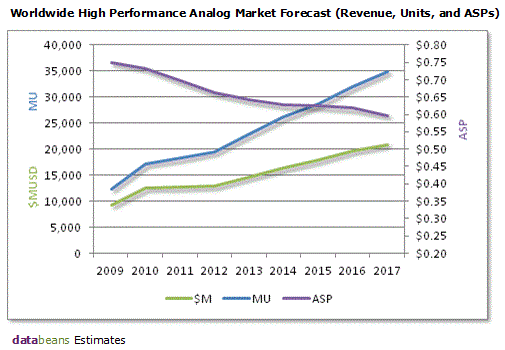Databeansによると、今年の世界におけるHPA市場は昨年から2%成長し、129億米ドルに達すると見込まれ、今後5年間はCAGR10%の成長が予測されています。HPA市場はさらに高性能ASSPと、汎用または「マルチマーケット」としても知られる高性能スタンダードリニアに区分されます。汎用HPAは2012年の売上が73億米ドルとなり収益の大部分を占めますが、アプリケーション専用製品は2017年までのCAGRが11%と予測されており、より急速に成長しています。