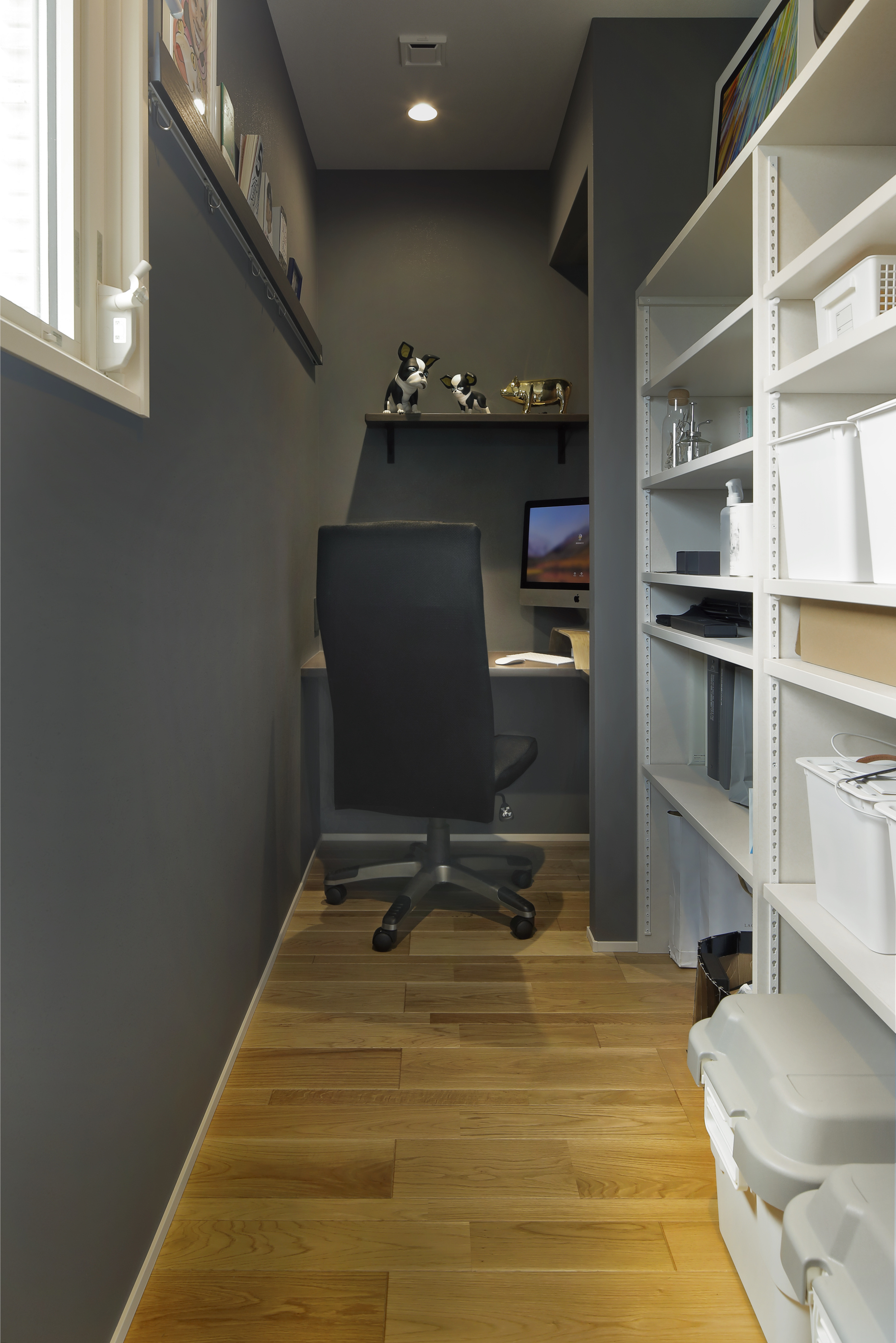 また、パントリー奥に、L字型のカウンターと本棚で書斎スペースをつくりました。ヨガ教室の生徒さんが出入りした際にも、夫・Yさんが落ち着けるようにと、サプライズで用意された空間です。夫・Yさんも、この書斎スペースを“自分の城”としてとても気に入っているそうです。