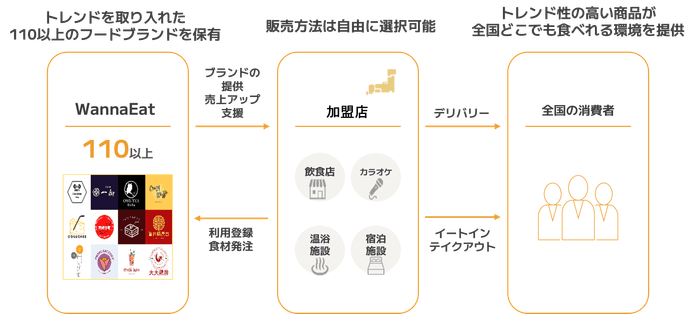 当社は話題のスイーツ・ドリンクや人気店の料理など110種類以上のフードブランドを開発しています。「フーシェア」は飲食店のほか、カラオケや温浴施設など飲食店営業許可を持つ全国の店舗・施設が加盟店となり、フードブランドを店舗のメニューとしてイートインやテイクアウトで消費者に販売できるほか、デリバリープラットフォームでも販売可能なサービスです。