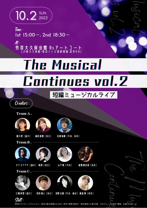 T ステージ主催、『The Musical Continues vol.2 短編ミュージカルライブ』』が2022年10月2日 (日)にR'sアートコート(東京都新宿区大久保1丁目9-10 労音大久保会館)にて開催されます。