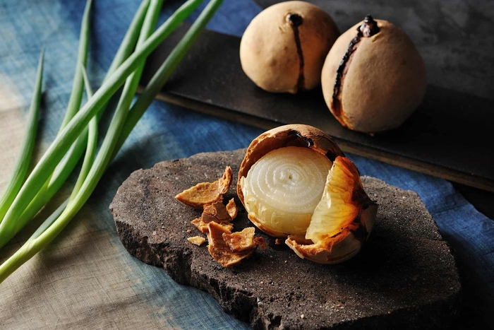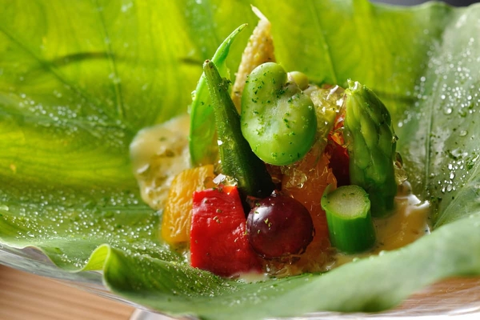 約30種の野菜を使った懐石料理を提供します。トマトやナスなど夏に旬を迎える野菜の多くは、東洋医学において身体の熱を冷ます働きがある食材です(*4)。軽井沢周辺では冷涼な気候を生かし、レタスなど葉物野菜を中心に、ズッキーニなどの果菜類、豆類が生産されています。信州ではそれらの野菜をそのまま食べるのはもちろん、夏場はぬか漬けにしたり、古漬けと一緒に細かく刻んでご飯にかけたりしてきました。夏の暑さで食欲減退しているときに、発酵食品である漬物の爽やかな酸味と塩味で食欲を増し、腸内環境を調えてきたといえます(*5)。身体の熱を冷ます夏野菜に、身体を温める発酵食品やねぎ・生姜などの薬味類を組み合わせることで、冷温のバランスを調えた食事を提供します。